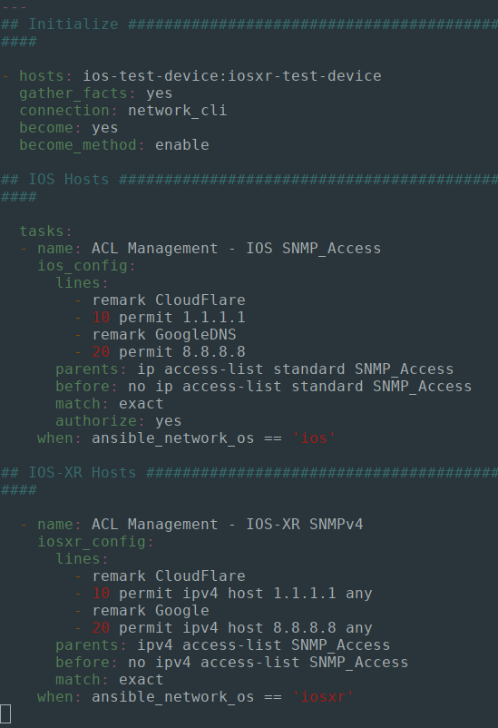 Because our network inventory feautures a mix of IOS and IOSXR devices, I am using the ios_config and iosxr_config Ansible modules conditionally to ensure that the ACL entries match the lines specified in the Playbook, and any discrepancies will then be configured by Ansible: