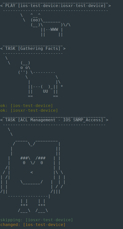 If cowsay is installed, Ansible takes it upon itself to make your day happier when running playbooks. If you decide that you would like to work in a professional cow-free environment, you can either uninstall cowsay, setnocows=1in ansible.cfg, or set theANSIBLE_NOCOWSenvironment variable... - Official Ansible Docs, 2019