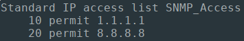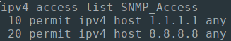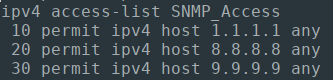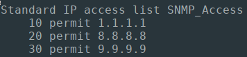 The below Ansible Playbook will configure standard access-lists for controlling our SNMP security, by matching all SNMP polling sources against an "SNMP_Access" ACL.