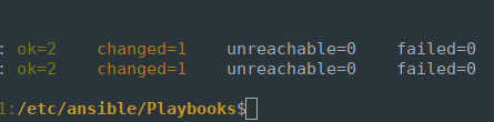 Running the Playbook against my two test nodes will produce the following recap report. From here we can see that both Ansible tasks were completed successfully (failed=0), and that changes were made to the configuration (changed=1):