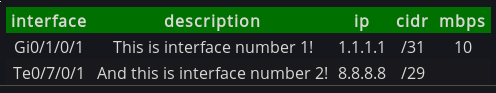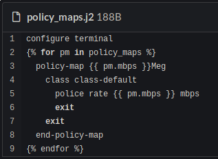 The above should be pretty straightforward to work out, but all I am doing it defining 2 IP interfaces with 5 key values each. Notice there is a "mbps" key that will correspond to a rate-limiting policy-map on our IOS-XR device? Well the second interface has not been provided a value for this key. If our Jinja2 conditional statement is correct, the Cisco configuration for the policy-map on the second interface should be omitted from the final render.
