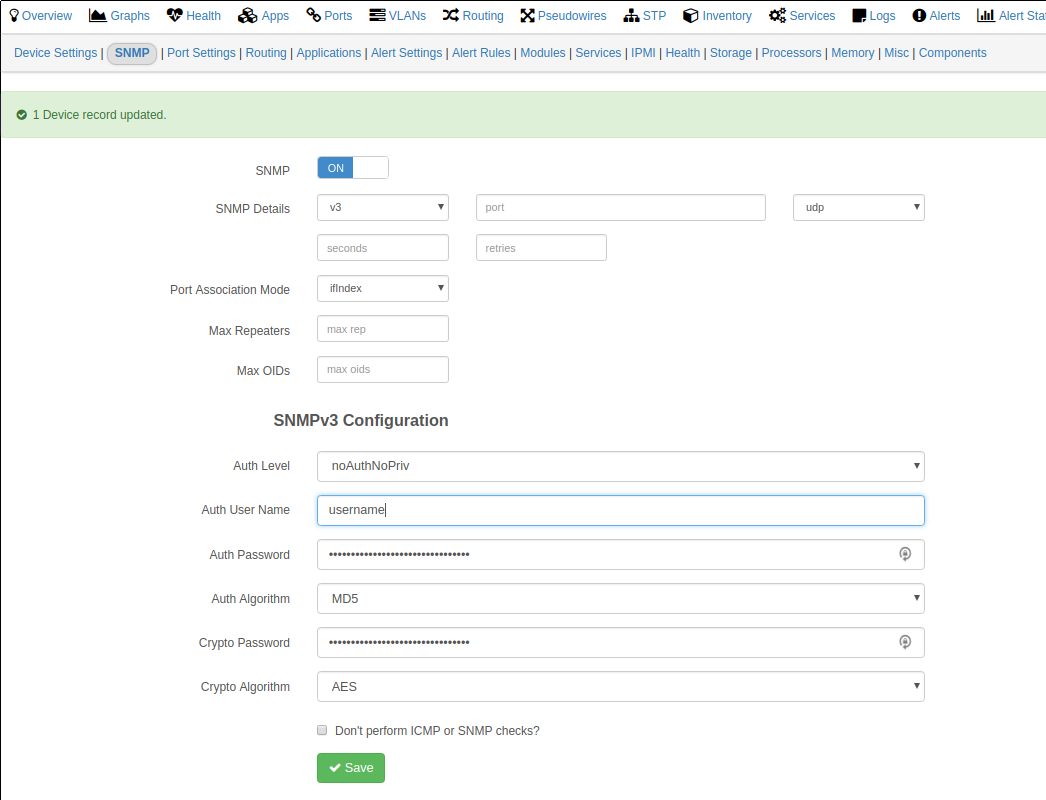 We are now SNMPv3! Set up each device on your SNMP collector. We use LibreNMS, and this can be done manually through the GUI:
