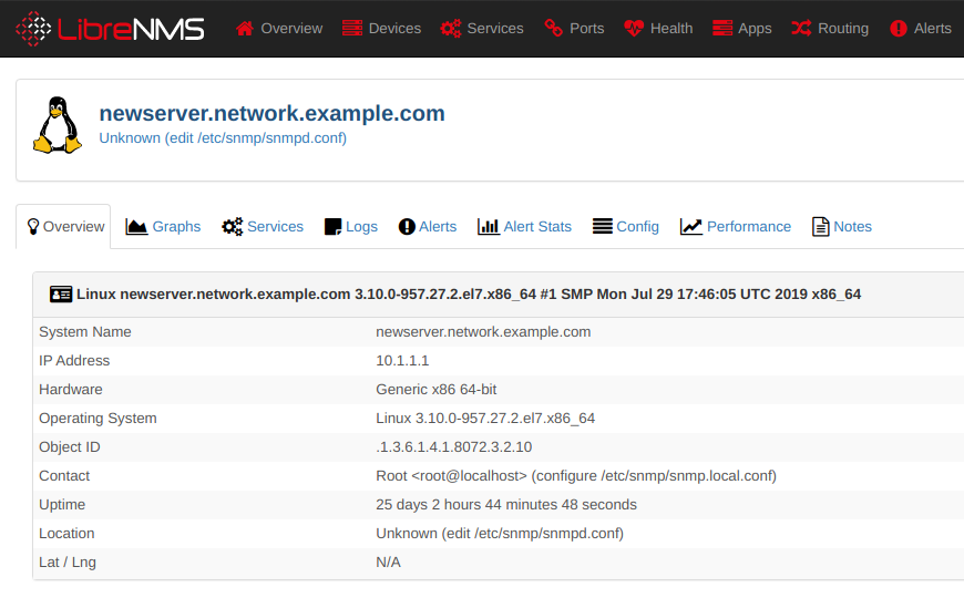 Now that the target host(s) have been setup for SNMP monitoring, we can go ahead and begin polling from our NMS. We use LibreNMS as our primary NMS for infrastructure monitoring, graphing, alerting and billing, and can vouch that it is simply a fantastic project that deserves all of the praise it can get.